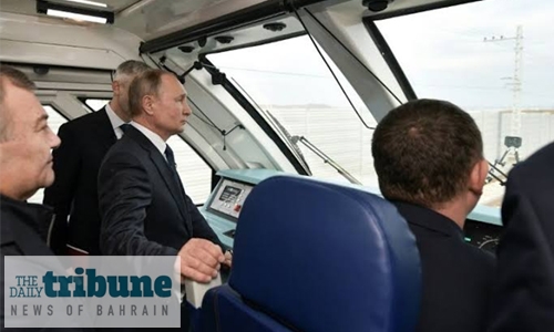 President Vladimir Putin yesterday stood in the driver’s cabin of a train for the official opening of a railway bridge that links annexed Crimea to southern Russia. During his ride starting in Kerch in Crimea in a shortened three-carriage train, Putin also spent time drinking tea with engineers on the 227-billion-ruble ($3.6-billion) project.