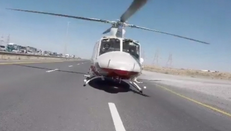 A video shared online shows a Ministry of Interior Air Wing helicopter landing on the busy highway and paramedics rushing towards an injured man lying next to a mangled truck.