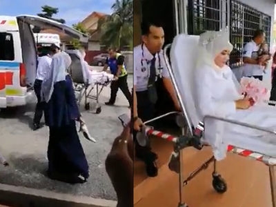 The footage shows the groom, in full paramedic's uniform, wheeling in the bouquet-holding bride on a stretcher while being assisted by their entourage in uniform. The couple's relatives can also be seen greeting them as they arrive.