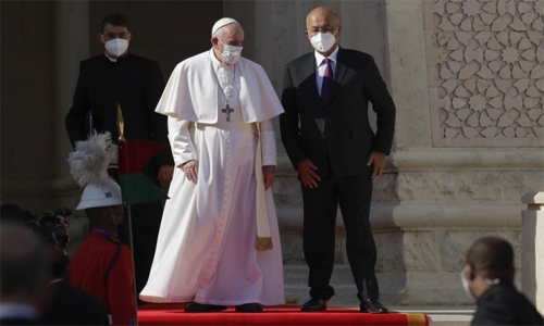 Salih greeted Francis outside the presidential palace. Both men wore masks as a band played the Vatican and Iraqi national anthems.