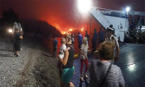 In apocalyptic scenes overnight and into Saturday morning, ferries evacuated 1,153 people from a seaside village and beaches on Evia, an island of rugged, forested mountains popular with holidaymakers and campers, after approaching flames to cut off other means of escape. People clutched babies and helped elderly people traverse a pebble beach to the small ferries. Behind them, towering flames and smoke blanketed the forested hills.