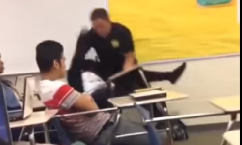 Footage of a white US policeman appearing to put a black female student in a headlock before flipping her off her chair and dragging her across a classroom floor has provoked outrage on social media.