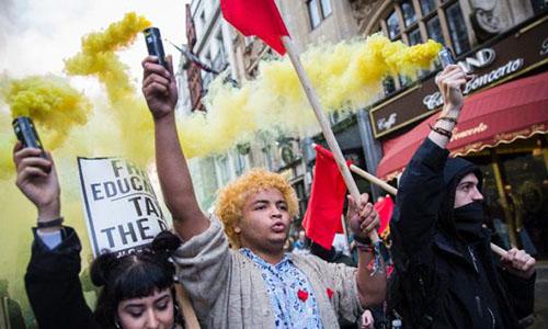 Caption: Protesters brandish smoke canisters at a demonstration against student fees in central London