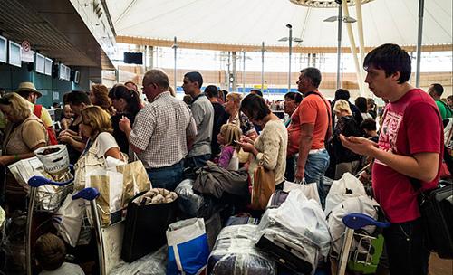 Caption: File Photo of passengers wait to check in for their flight out of Sharm El-Sheikh airport
