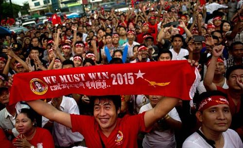 Decked out in the trademark red of Myanmar's opposition, hundreds gathered at its Yangon headquarters on Monday as anticipation of victory for Aung San Suu Kyi's party soared with poll results hinting at the once unthinkable -- a government they elected.