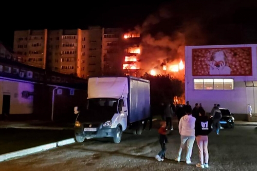 Images on social media showed a Soviet-era residence block engulfed by flames.
