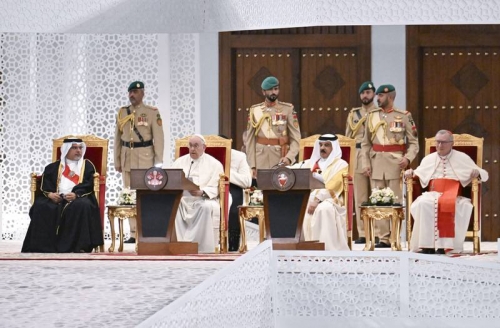The pontiff spoke at Sakhir Royal Palace outside Manama, where members of Bahrain's royal family, government officials and hundreds of media outlets gathered.
