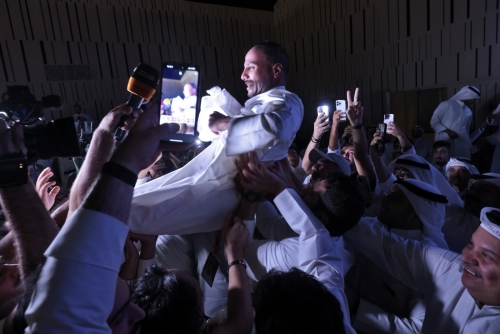 Picture Caption: Kuwaiti candidate and former parliament speaker Marzouq al-Ghanim celebrates with his supporters following the announcement of his victory in legislative elections, in Kuwait city.