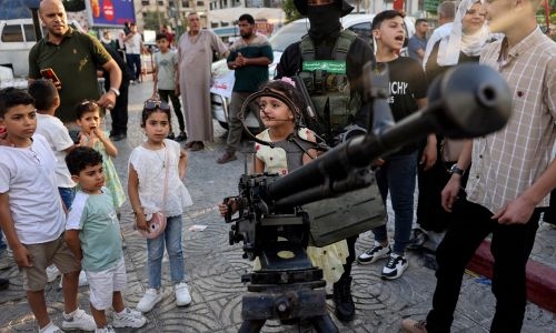 The exhibition is “encouraging and means that the liberation of our land is near”, added Shahadeh Dalou, who also came with his children. Bassam Darwish, 58, said people wanted to show their support for the Al-Qassam Brigades. Hamas is considered a terrorist organisation by the United States, Australia, Britain, Israel and the European Union.