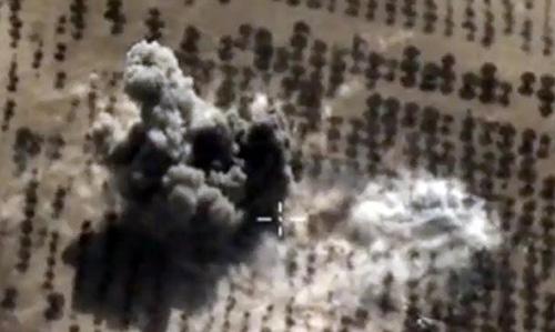 Caption: A video image of an explosion after air strikes carried out by Russian warplanes in the Syrian province of Idlib (Yahoo!)