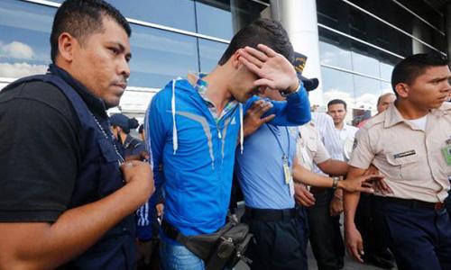 Caption: Honduran policemen escort one of five Syrian citizens arrested at the Tocontin international airport in Tegucigalpa. (Yahoo!)