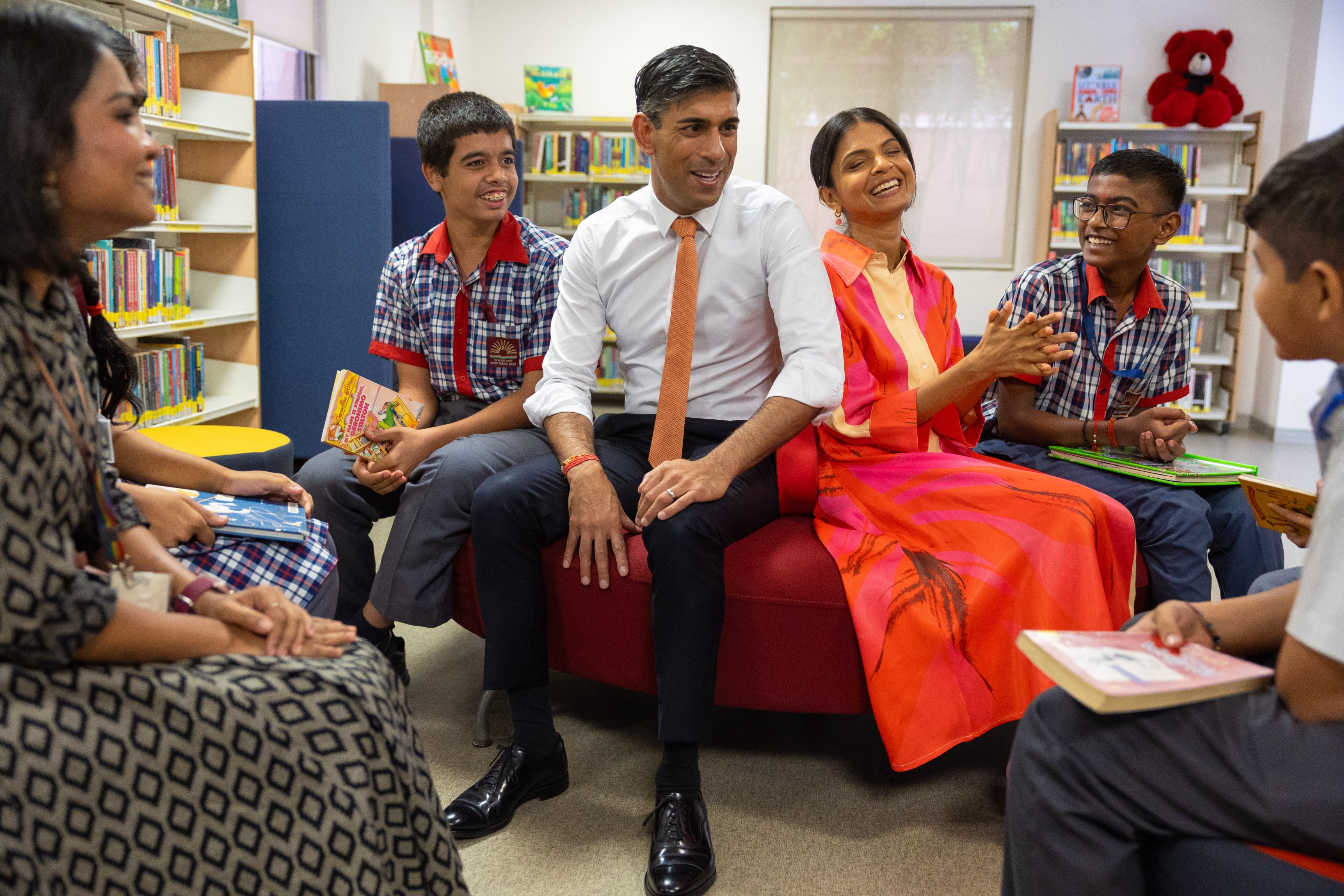 Sunak meeting students and staff at British Council in India. On the meeting, he wrote on X, “Before meeting the world leaders of today I’ve been meeting with the world leaders of tomorrow.”