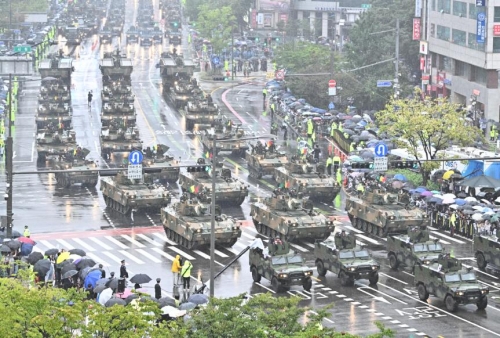 The last parade was in 2013. Five years later, then-president Moon Jae-in chose to hold a celebratory ceremony instead of a military event, in line with his conciliatory approach to North Korea. Around 4,000 troops marched through central Seoul on a rain-soaked afternoon, cheered by umbrella-bearing crowds who waved South Korean flags.