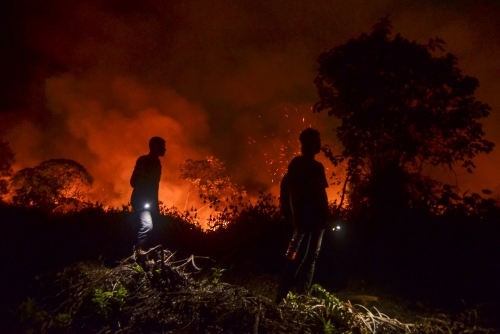 Firefighters on the western Indonesian island of Sumatra battled large peatland fires this month that covered Palembang, an Indonesian city of nearly two million people, in haze for weeks.