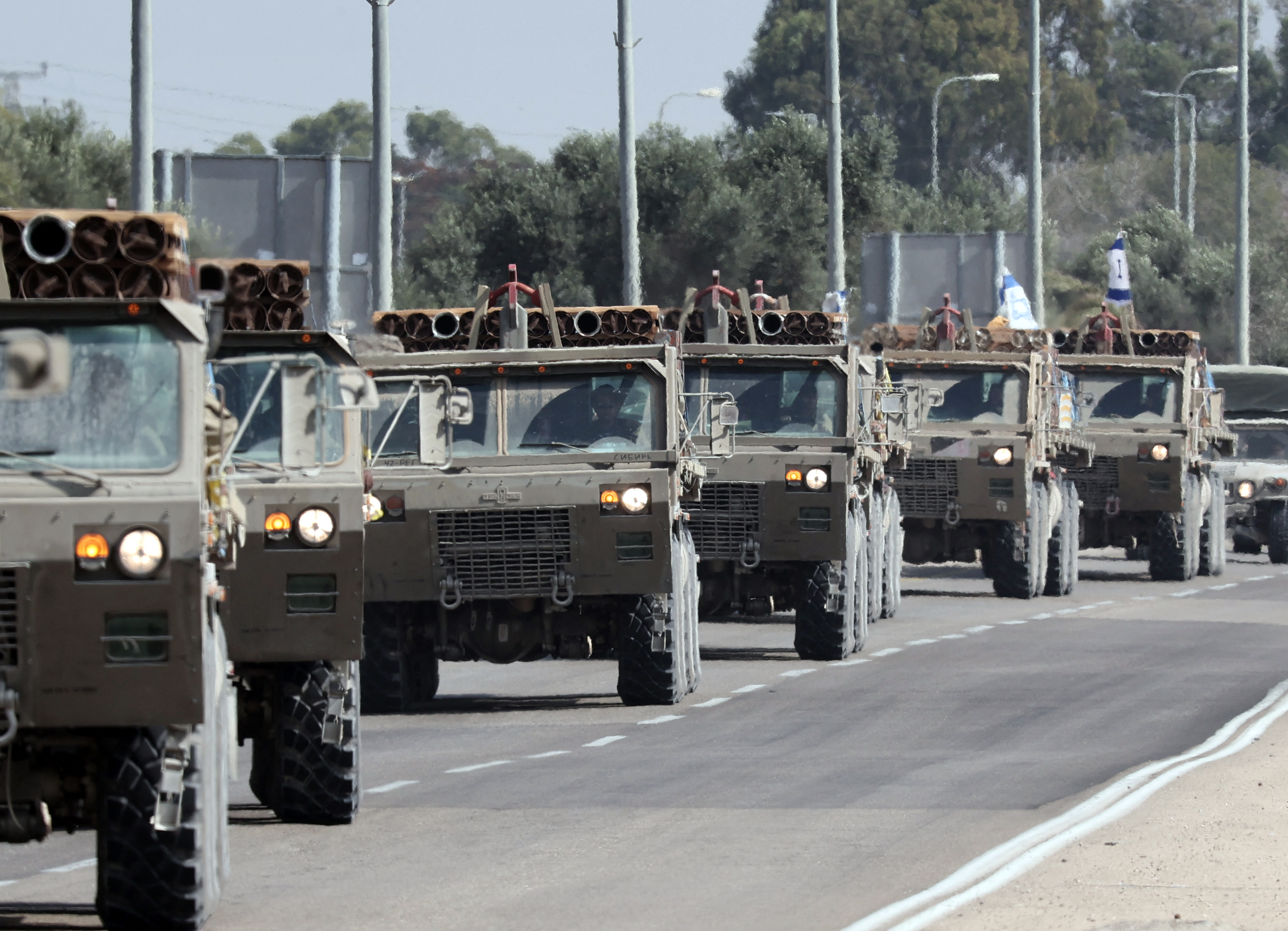 A convoy of Israeli army trucks carrying mortar shells advances on a road near the southern city of Sderot