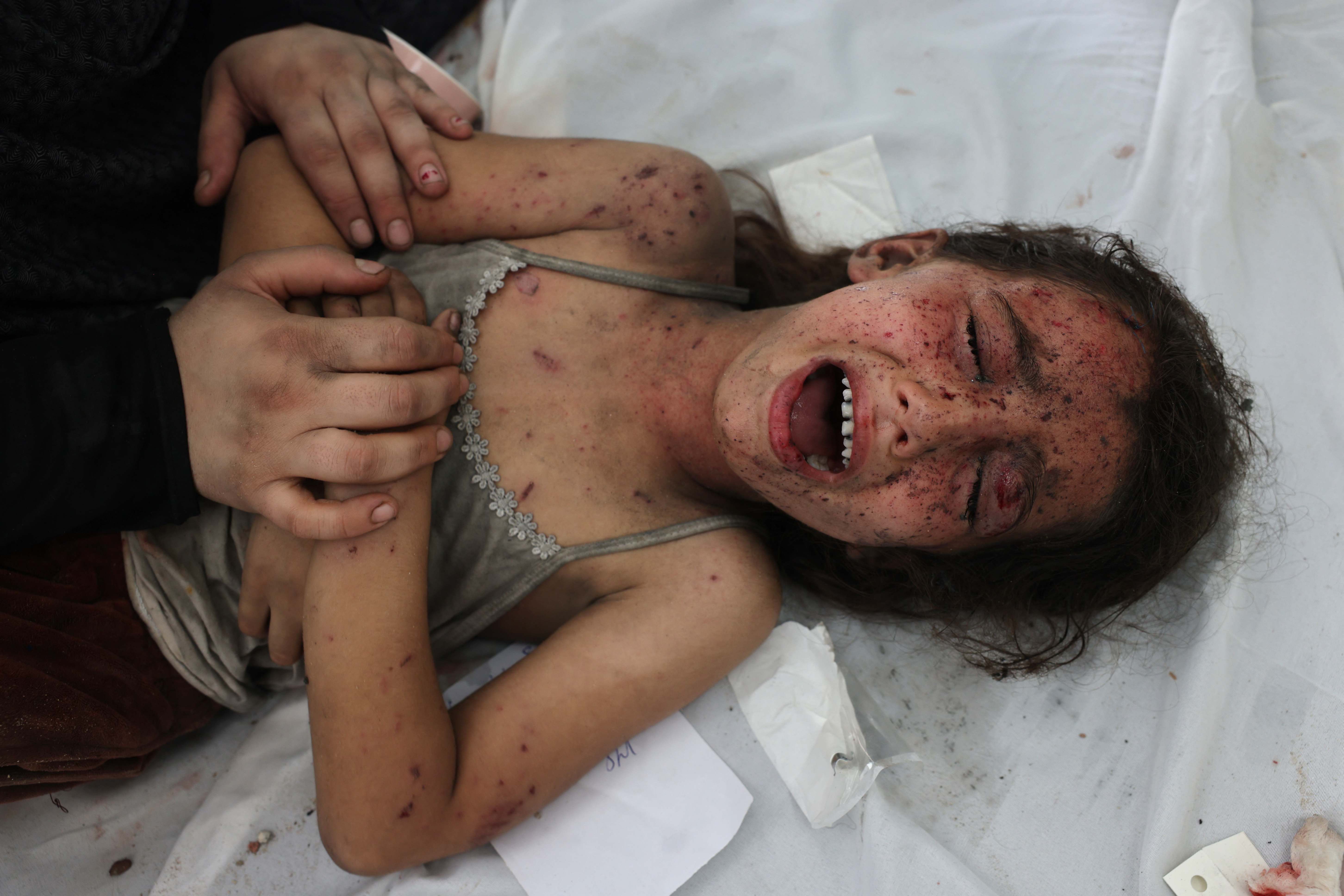 A young Palestinian girl has her hand held by a relative as a medic treats her wounds at a hospital following an Israeli air strike in Rafah, in the southern Gaza