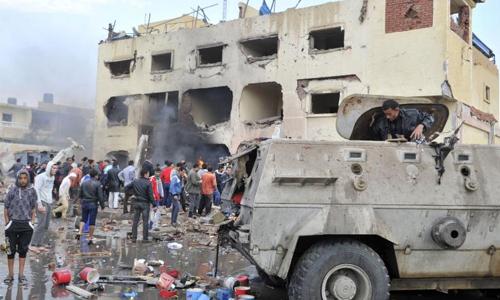 Photo Caption: Two bomb blasts outside a hotel in the Egyptian city of Al-Arish killed at least three people Tuesday. In this photo, an Egyptian man stands in an armored vehicle as residents gather outside a police station in North Sinai's provincial capital of al-Arish after it was targeted by a car bomb on April 12, 2015.