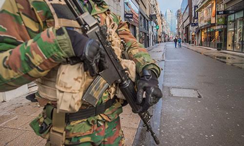 Caption: A Belgian soldier stands guard in Rue Neuve, the busiest shopping street in Brussels, now empty due to the terror alert level being elevated to 4/4 (The Independent)