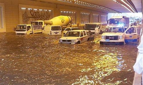 About 10 cars were submerged under about two metres (more than six feet) of water in a highway underpass in the Labban district on the capital's western outskirts, an AFP photographer reported. Workers were trying to drain the floodwaters into tanker trucks as a light rain fell from gloomy skies.