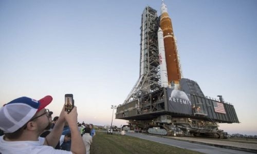Rocket carrying American lunar lander rolls to launchpad