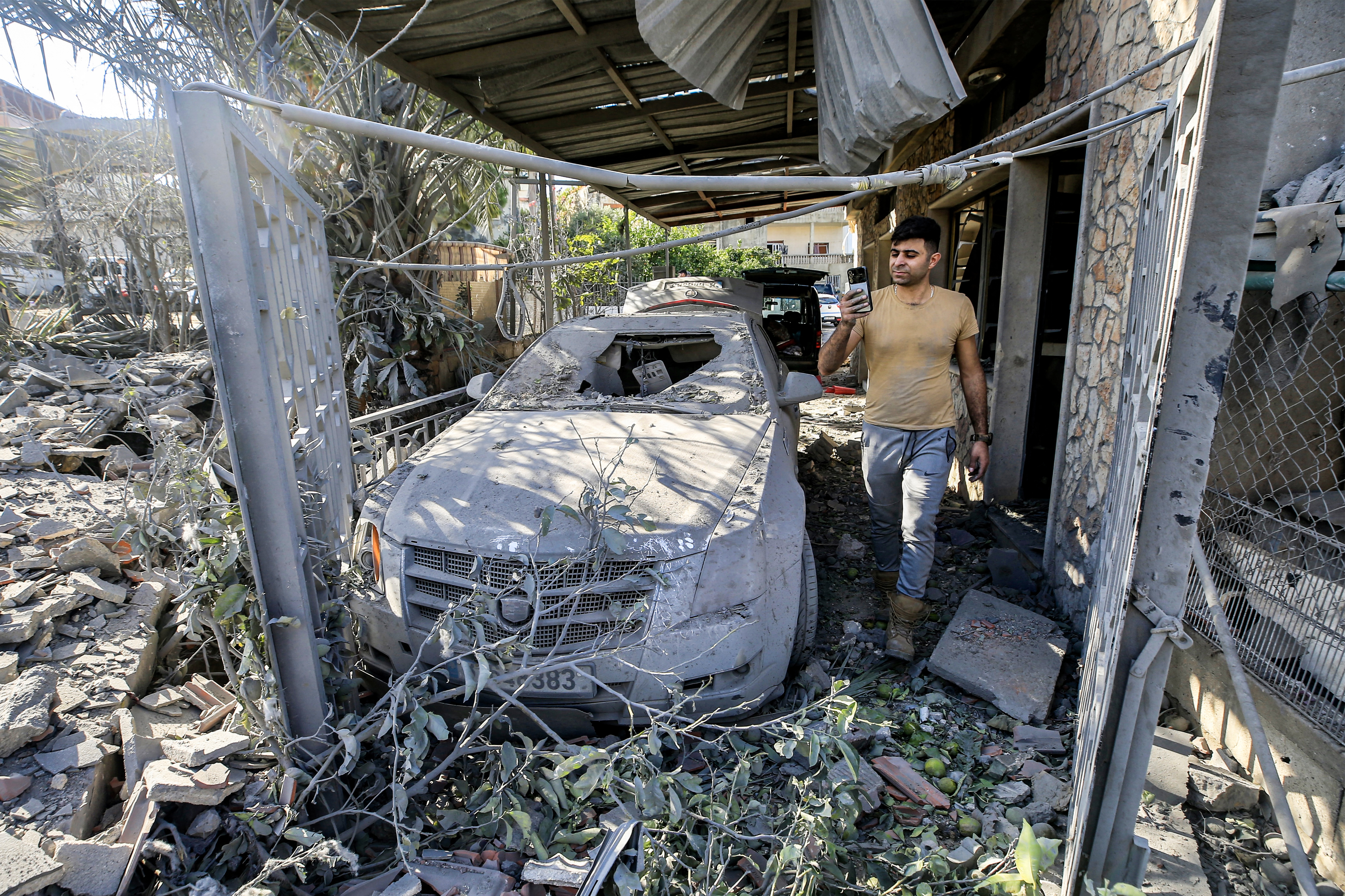 A man films with his phone while walking past a damaged vehicle through debris following strikes on the the town of Naqura in southern Lebanon