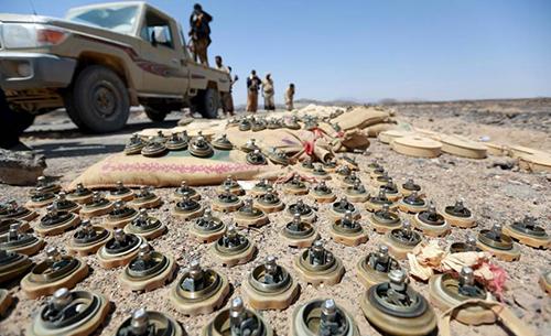 Caption: Soldiers loyal to Yemen's government stand next to mines planted by the Houthi group in locations where they controlled in front line in the province of Marib
