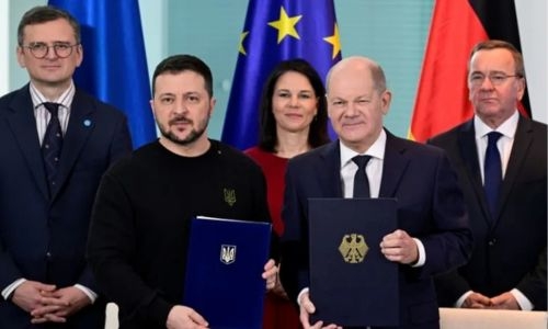 Ukraine’s President Volodymyr Zelensky signed a security deal with Germany yesterday in Berlin, hailed by Chancellor Olaf Scholz as a “historic step” amid Kyiv’s raging battles against Russia.