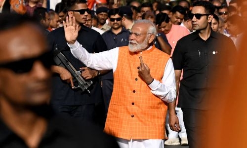 Modi walked out of a polling booth early morning in the city of Ahmedabad while holding up a finger marked with indelible ink, flanked by security personnel and cheered by supporters.